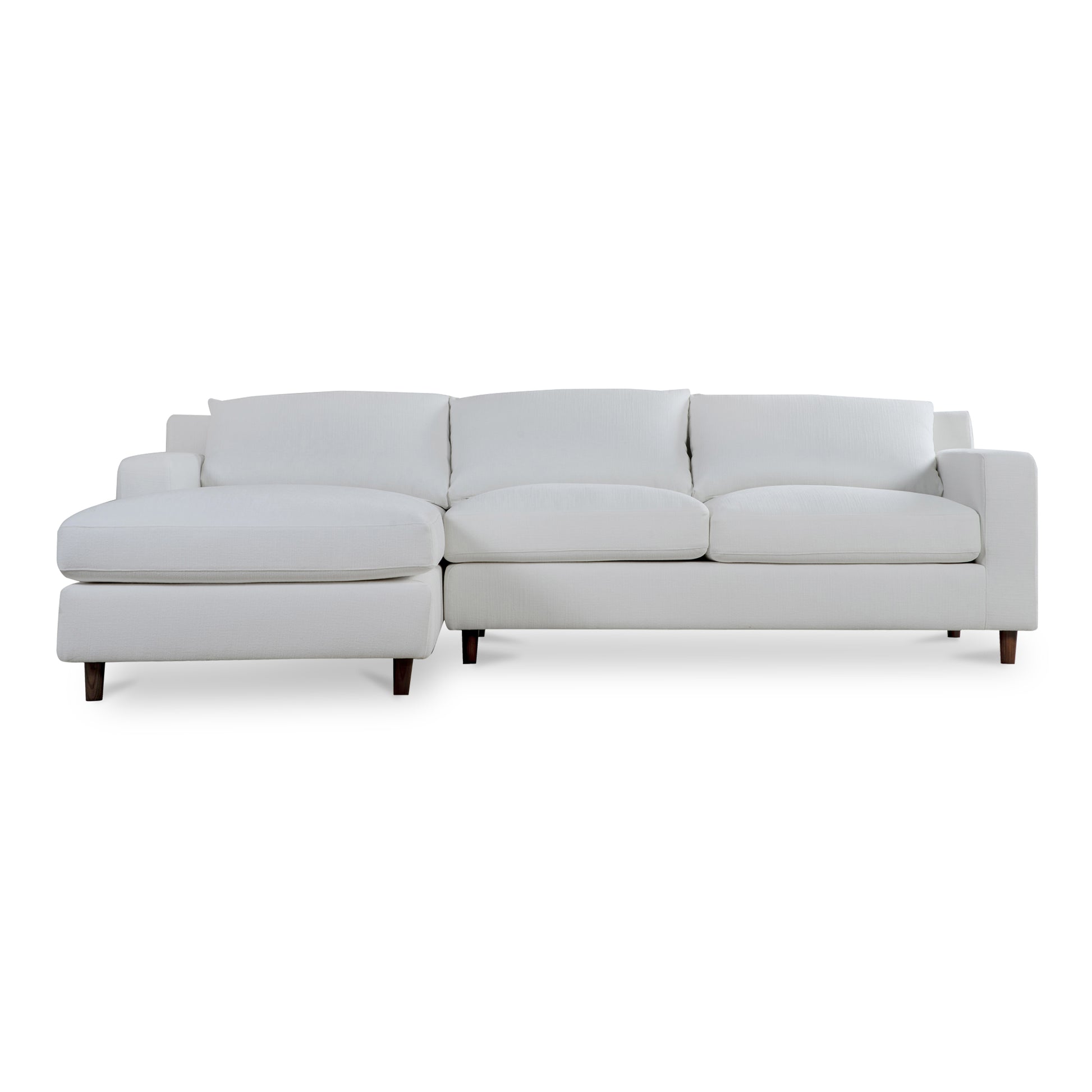 The Hutton sectional features soft-to-the-touch chenille fabric constructed from 100% polyester treated with C0 performance technology. A traditional higher back and tapered dark wood legs nod to mid-century aesthetics while providing contemporary coziness as a plush feather topper ensures unparalleled comfort.