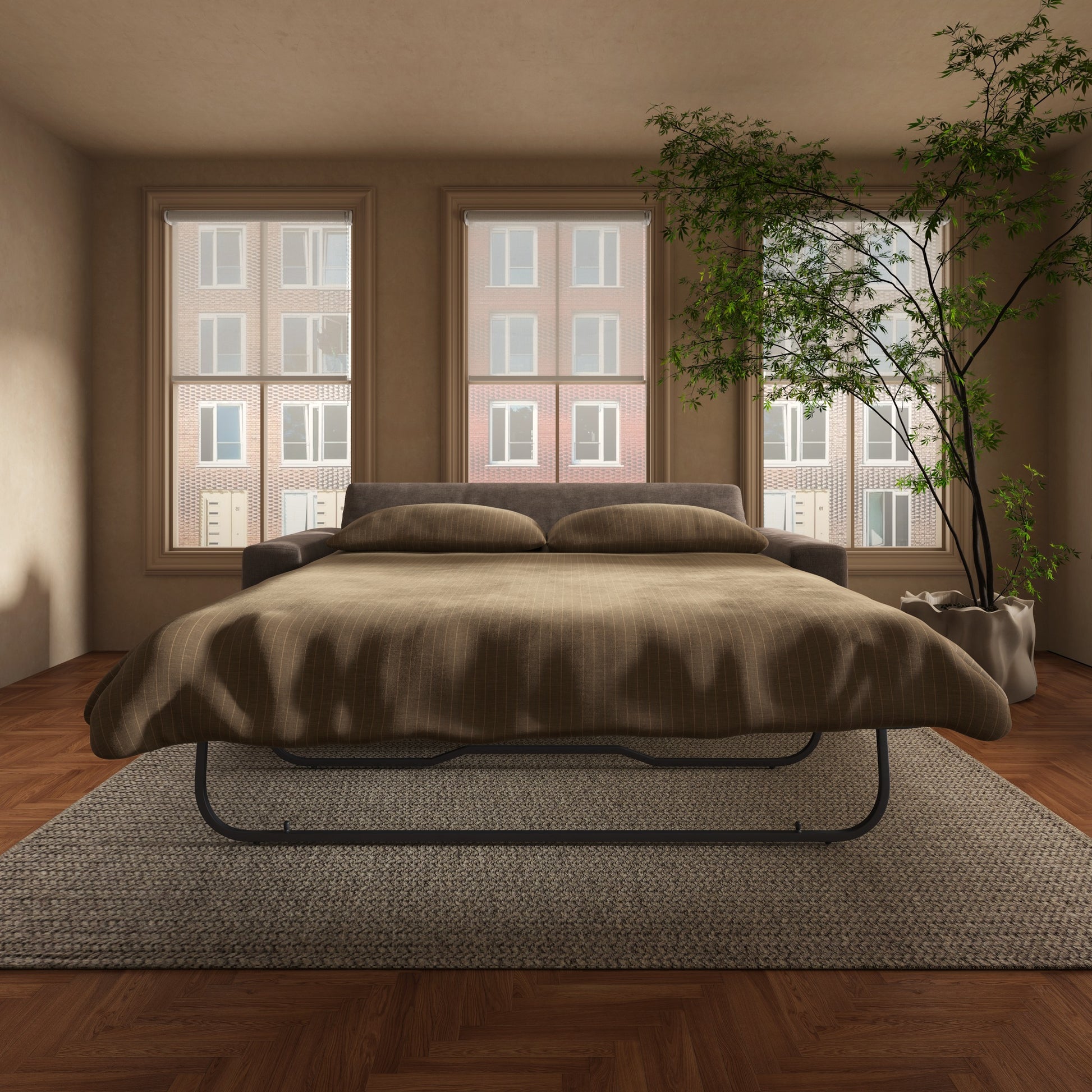 Movie nights to overnight guests—Kiran's got you covered. With wide track arms and a deep charcoal velvet finish, this sleeper sofa balances modern style with everyday comfort. A short queen mattress folds out smoothly using a Leggett & Platt mechanism. Built on a solid beech and plywood frame with fiber-wrapped cushions. Style by day, function by night—Kiran works both shifts.