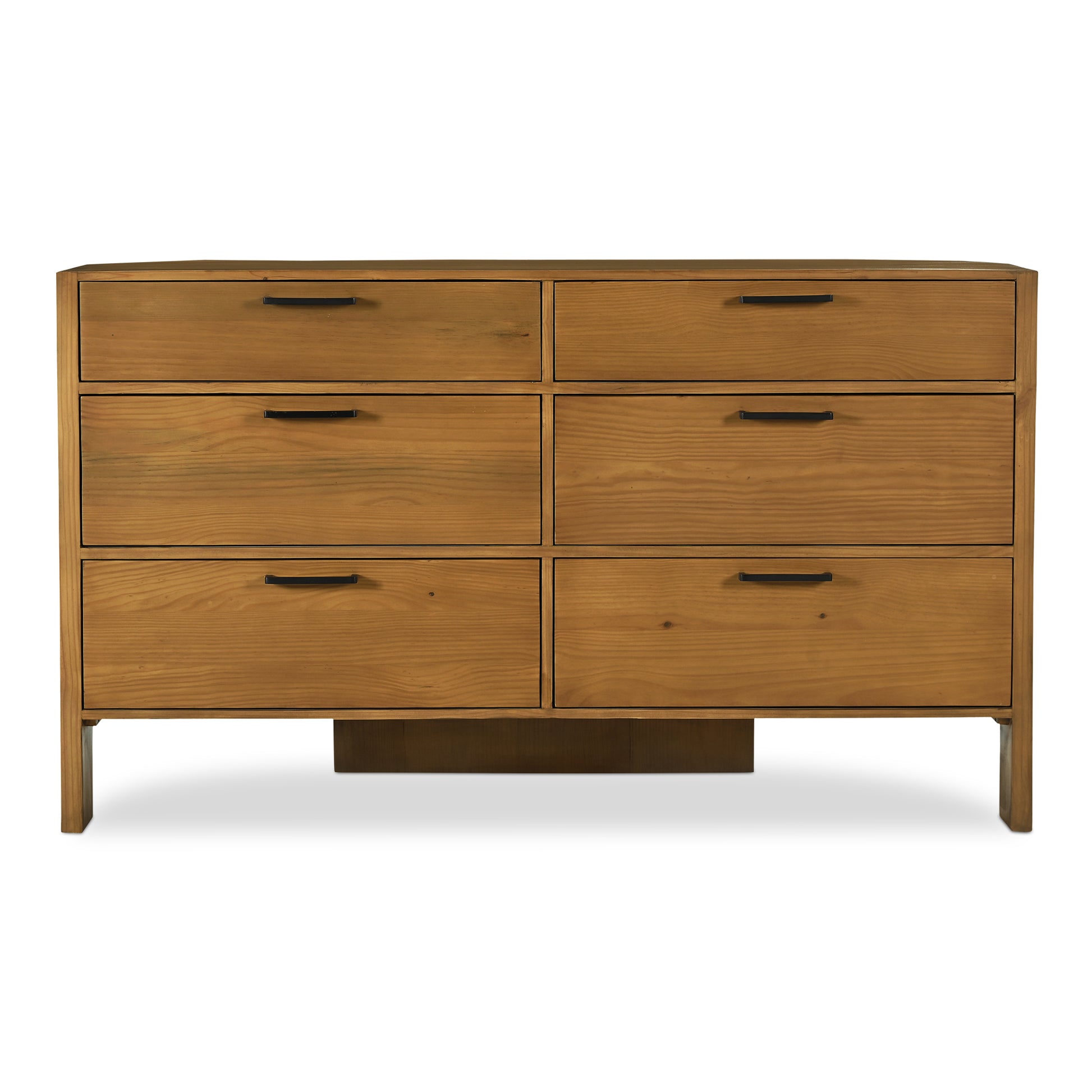 The Lachlan 6 drawer dresser adds a fresh twist to mid-century and Scandinavian aesthetics with its unique three-legged design and gently curved back. Crafted from pine, it features visible joinery for a touch of artisanal charm, punctuating its floating silhouette. The dresser has 6 soft-close drawers and is finished on all sides, ensuring both function and versatility go along with its sleek, modern lines.