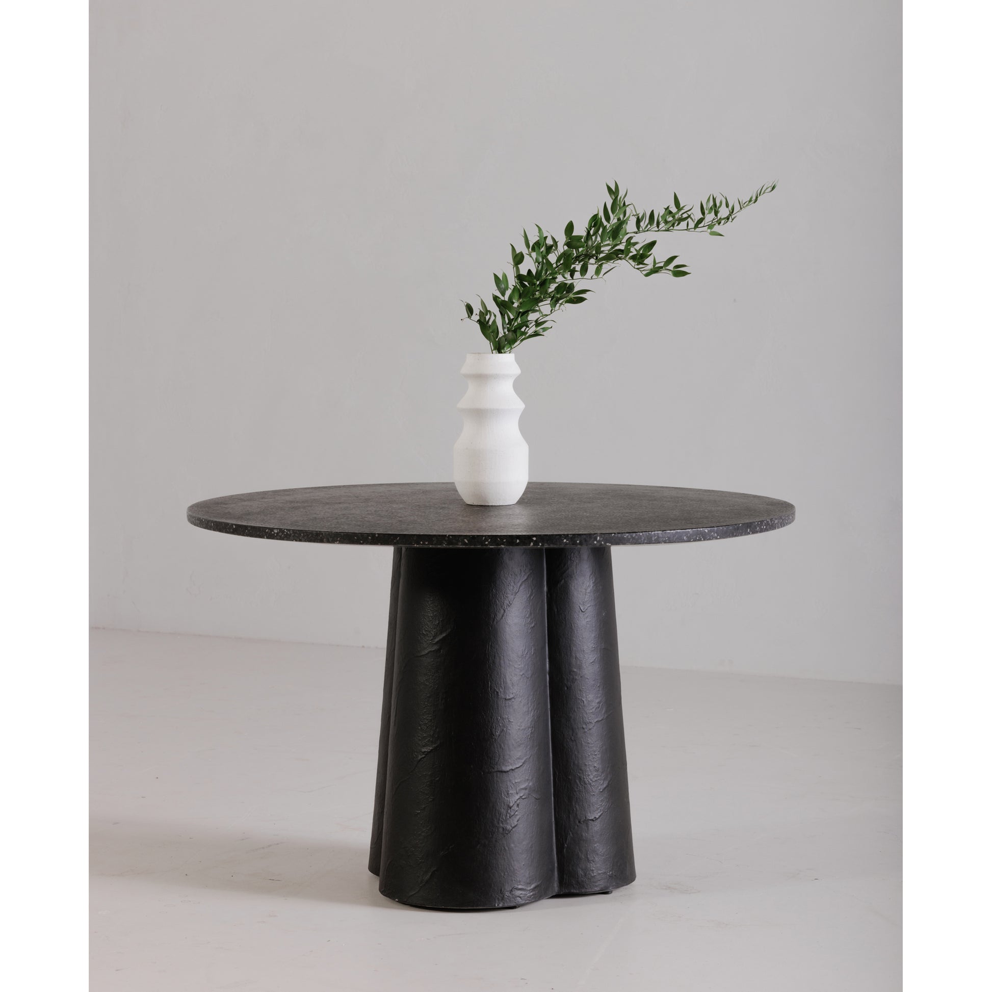 Sculptural lightness meets the unique beauty of terrazzo to create the Mono, a dining table perfect for interior spaces as well as outdoor oases. A ribbed central base provides both practical and artistic flair flowing upward into a round terrazzo tabletop with natural flecks and pops of minerals.