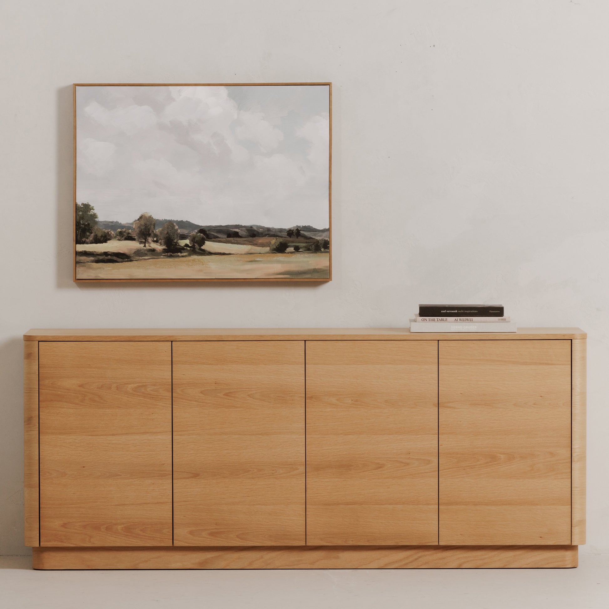 Corners, consider yourselves softened. The Round Off Sideboard takes Scandinavian simplicity and rounds it out with gently curved edges and a light oak finish. Designed with a calming presence, its natural wood grain veneer is grounded on a solid rubber wood base. Four seamless doors hide spacious storage, proving minimalism can be practical too. A piece that balances softness and structure, it’s where natural beauty meets everyday ease.