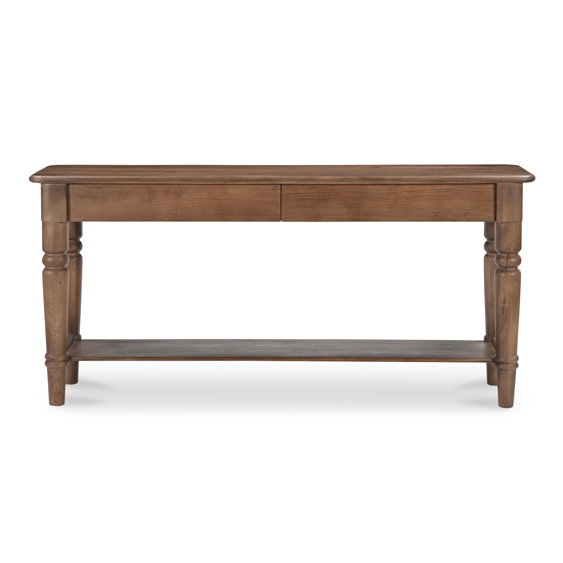 The Russet console table features beautifully turned legs, intricately carved details, and a mid-tone brown finish that fits seamlessly into traditional and transitional homes. Adding to its charm are two large horizontal drawers for additional storage with a shelf underneath. These are complemented by an overhanging tabletop that enhances its classic aesthetic--a timeless centerpiece, enriching the dining experience with style and functionality.