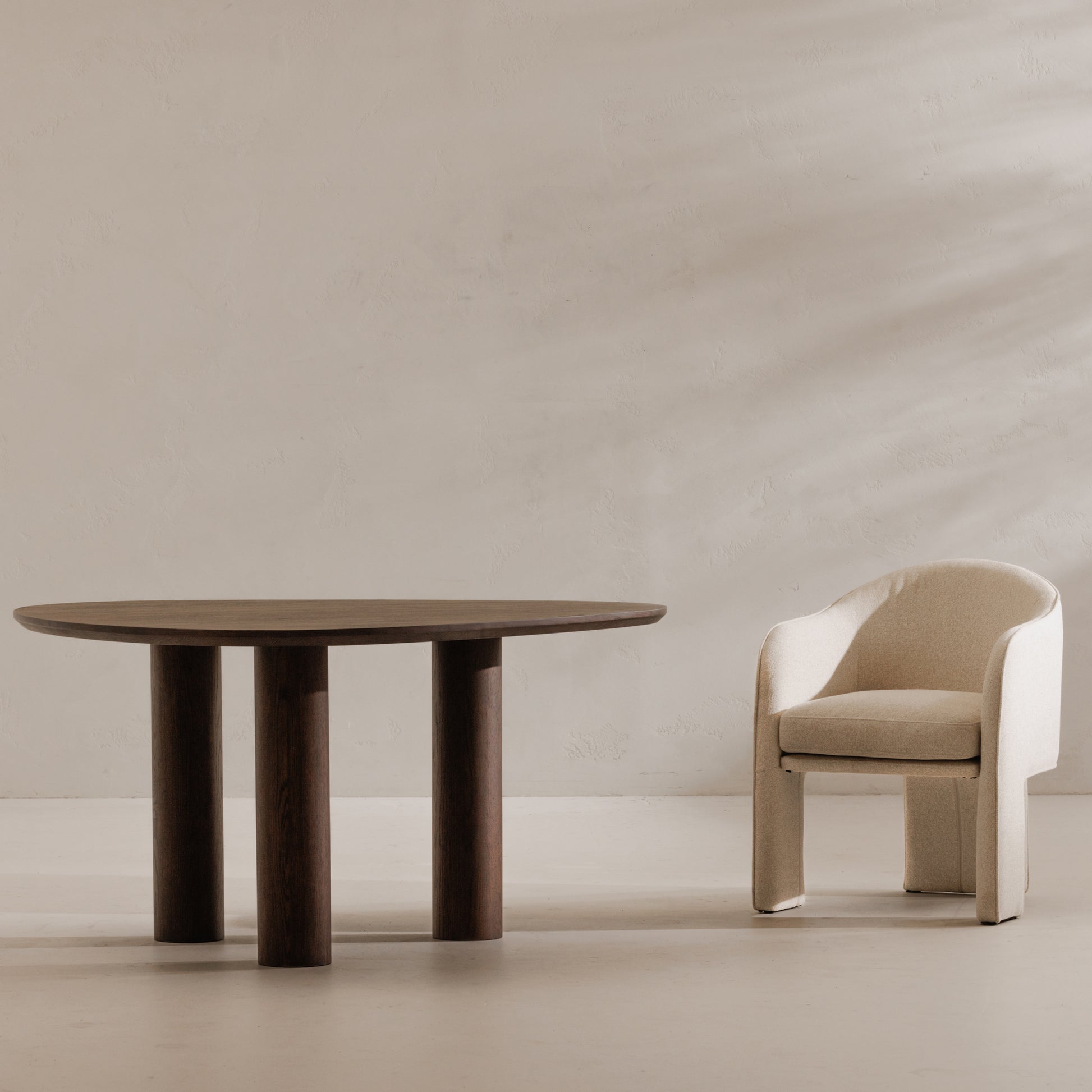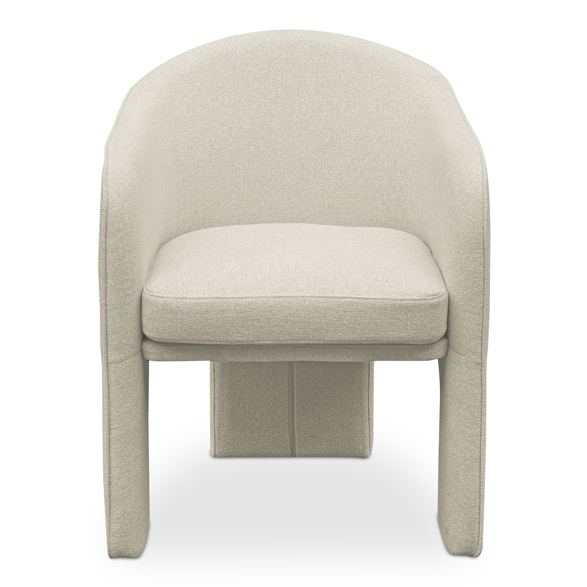 Fully upholstered in easy-to-clean performance fabric and generously sized, the Clara dining chair is all about comfort with a thoughtfully rounded back and gently curved armrests that add a touch of elegance and femininity. The sleek and minimalistic 3-legged base provides a clean and refined foundation.