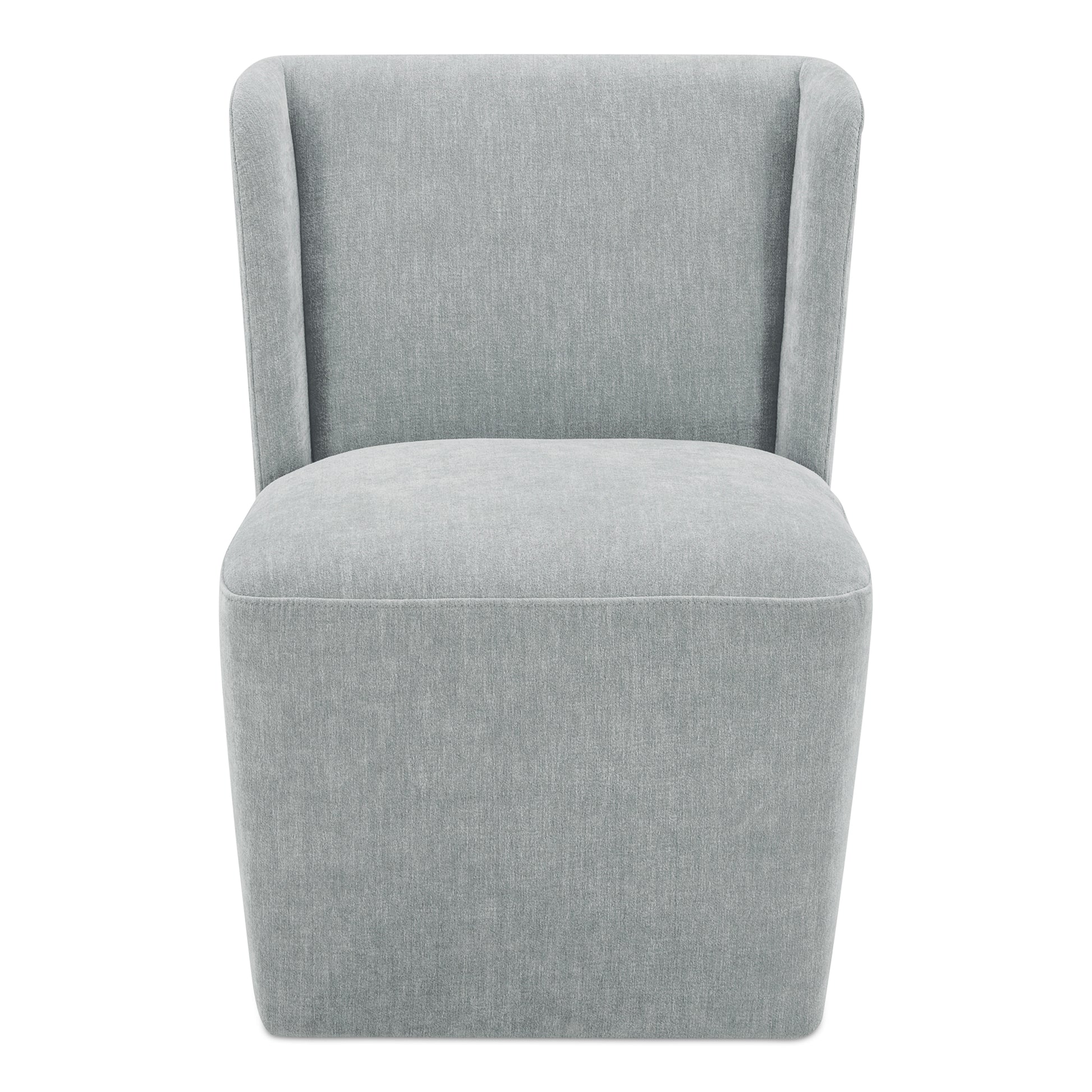 The Cormac rolling dining chair is all about comfort with a generously padded seat and backrest, a slight curve of the back and caster wheels that effortlessly glide across the floor. Crafted from high-performance fabric that is soft to the touch yet resilient against stains, spills, and daily wear.