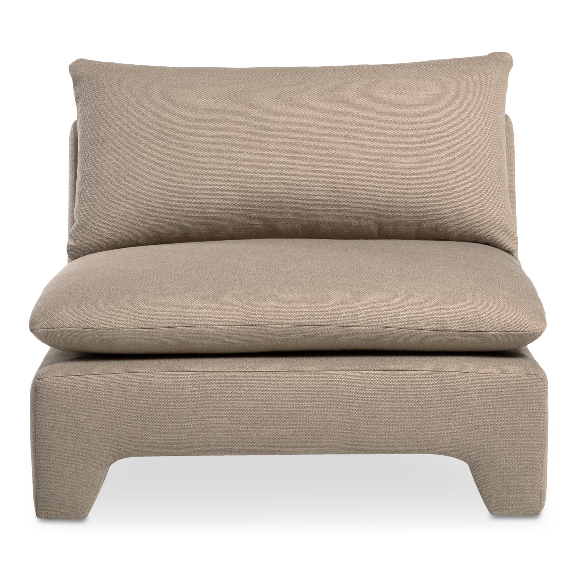 The Estelle lounge chair seamlessly blends vintage inspiration with a contemporary approach, pairing its armless silhouette with fully upholstered padded legs. A sink-into seat brings the plush comfort of Dacron fiber and feather-fill, while the linen blend fabric adds a relaxed, lived-in look.