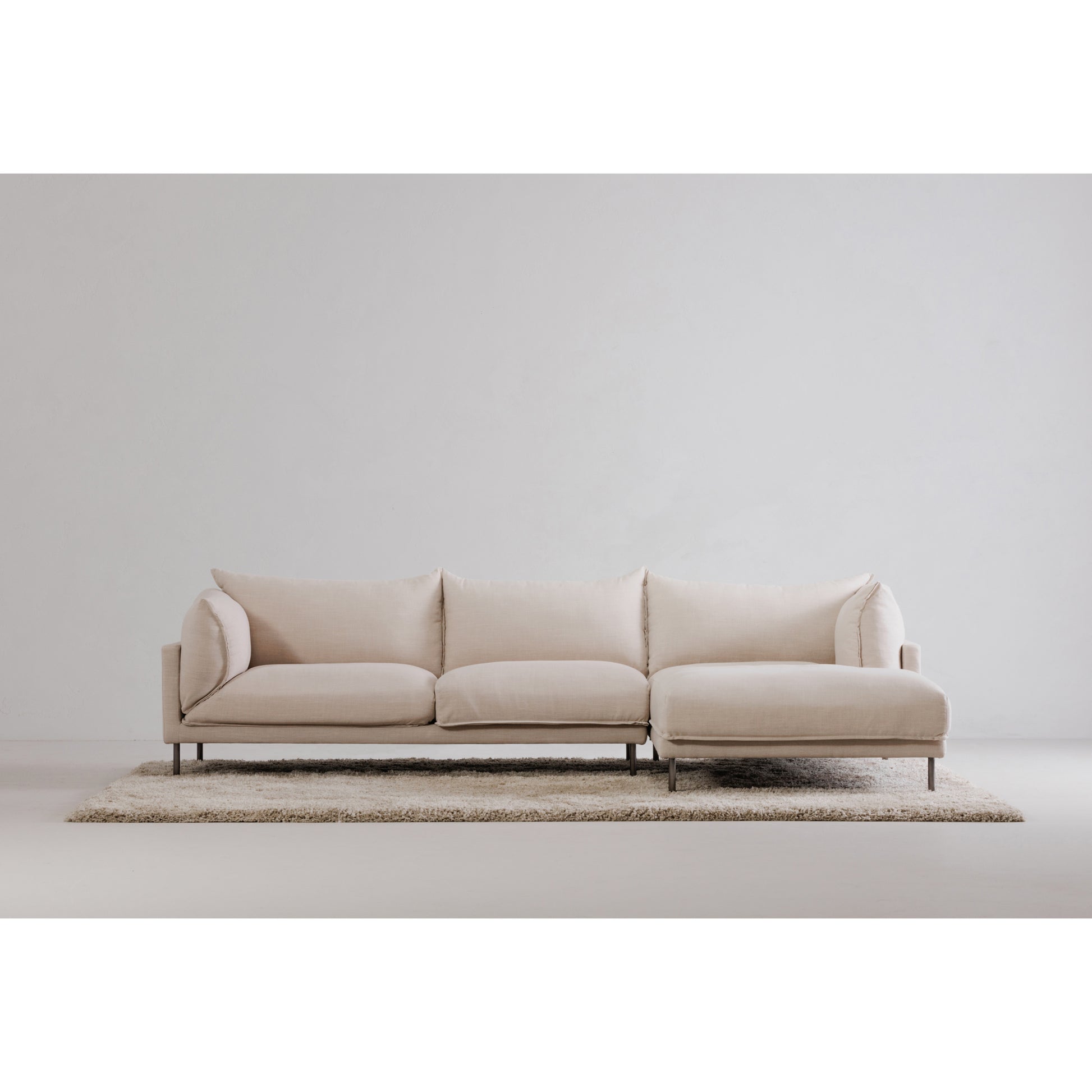 Scandinavian styling, a softly blocked silhouette, and neutral tone in a linen-blend textile, the Jamara right-facing sectional balances everyday simplicity with deep-seated comfort and plush down wrapped cushioning. Unwind, relax, and tone it all down with its muted taupe upholstery that leaves room for layering different shades and textured accents to your living space. Jamara features slim steel legs, clean stitch lines and removable seat and back cushions. Find balance in simplicity and sink right into this loveable design.