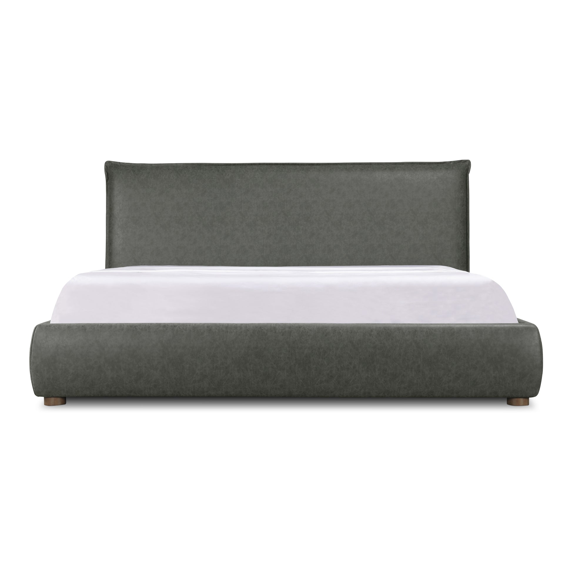 Upholstered from a soft, vegan leather, the Luzon bed is relaxed and welcoming. Its padded headboard and solid pine and engineered wood frame make it comfy and reliable, while its timeless design and neutral tone showcase a classic, practical look.