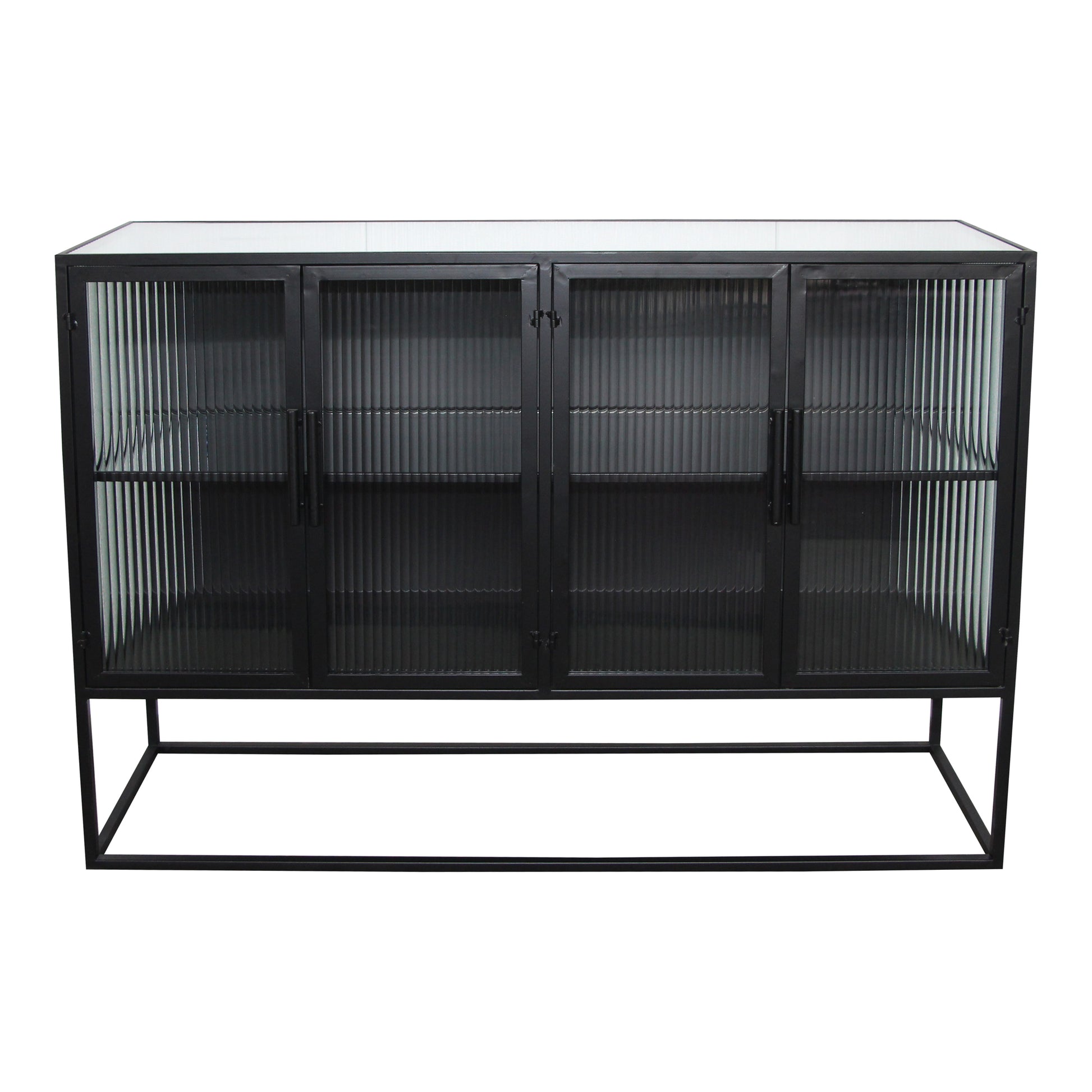 This tough, industrial luxe cabinet is a definite answer to your storage dilemmas. In a clean-cut iron frame with vertical handles, four soft-close cabinet doors, and beautifully ribbed glass front and sides, this glass-shelved unit is ideal for the living or dining room. The Tandy is versatile, functional décor for your display- you could even try it out as a bar arrangement with glassware and mixes stored underneath.