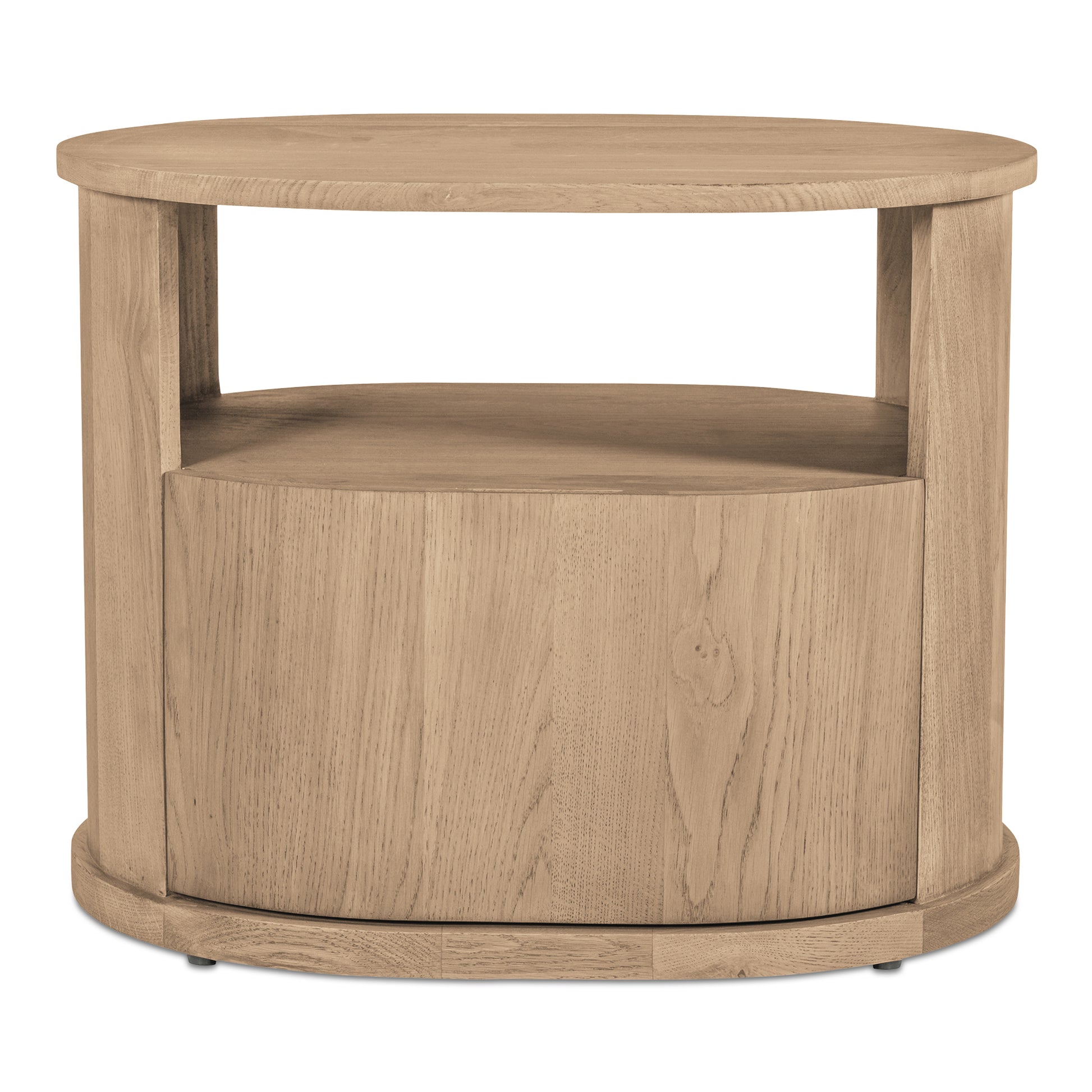 The Tommy nightstand embraces modern simplicity in a natural finish. Its distinctive racetrack capsule shape adds a contemporary touch to the bedroom, seamlessly blending form and function. This nightstand features a solid oak frame with oak veneer details, offering durability and refined style. The soft-close drawer and open shelf provide versatile storage options in a piece that speaks to modern appeal.