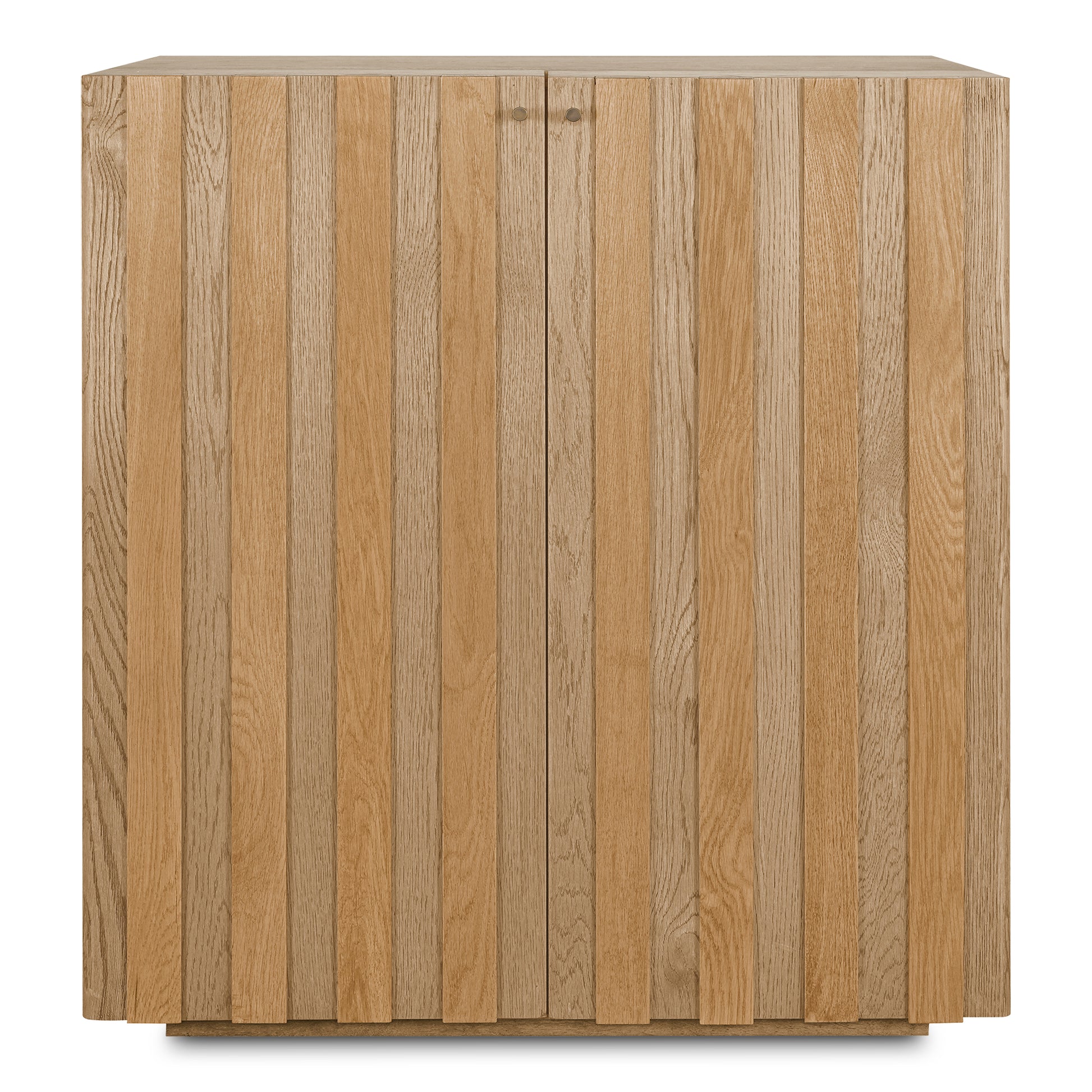 The Vermentino bar cabinet draws inspiration from Italian vistas and mid-century design. Named after a cherished Italian wine, it echoes the simplistic elegance found in a small, unforgettable Italian cafe. Its distinct two-tone striped wood veneer nods to blissful memories as its classic Italian mid-century elements provide a contemporary yet timeless sip of Italy's renowned design heritage.